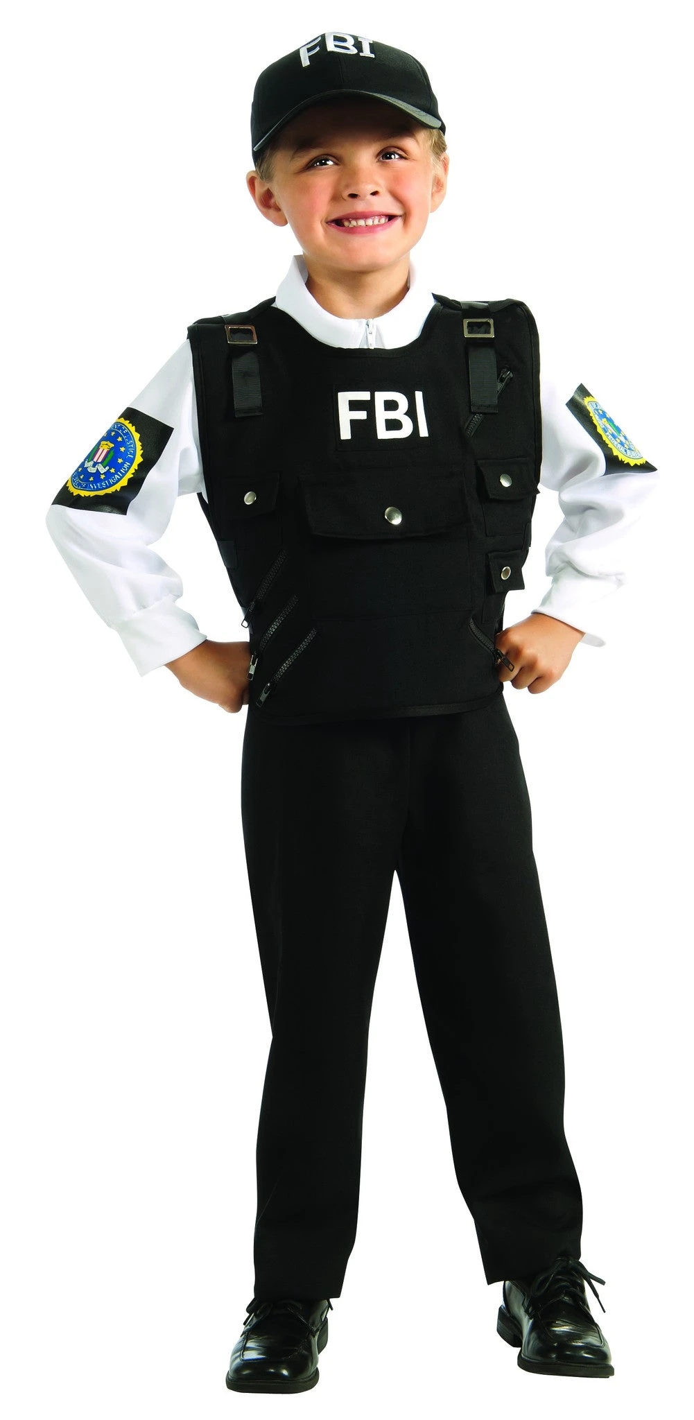 - Includes white long sleeve shirt with FBI logos, FBI logo black vest, and FBI logo cap.